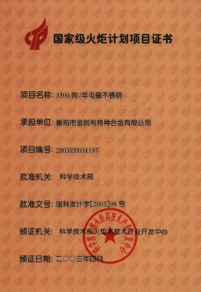 • 國(guó)家級(jí)火炬計(jì)劃項(xiàng)目證書
